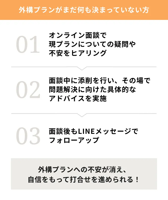 - 当サービスはオンライン面談を基にした図面やパース等の資料作成のみとなります。